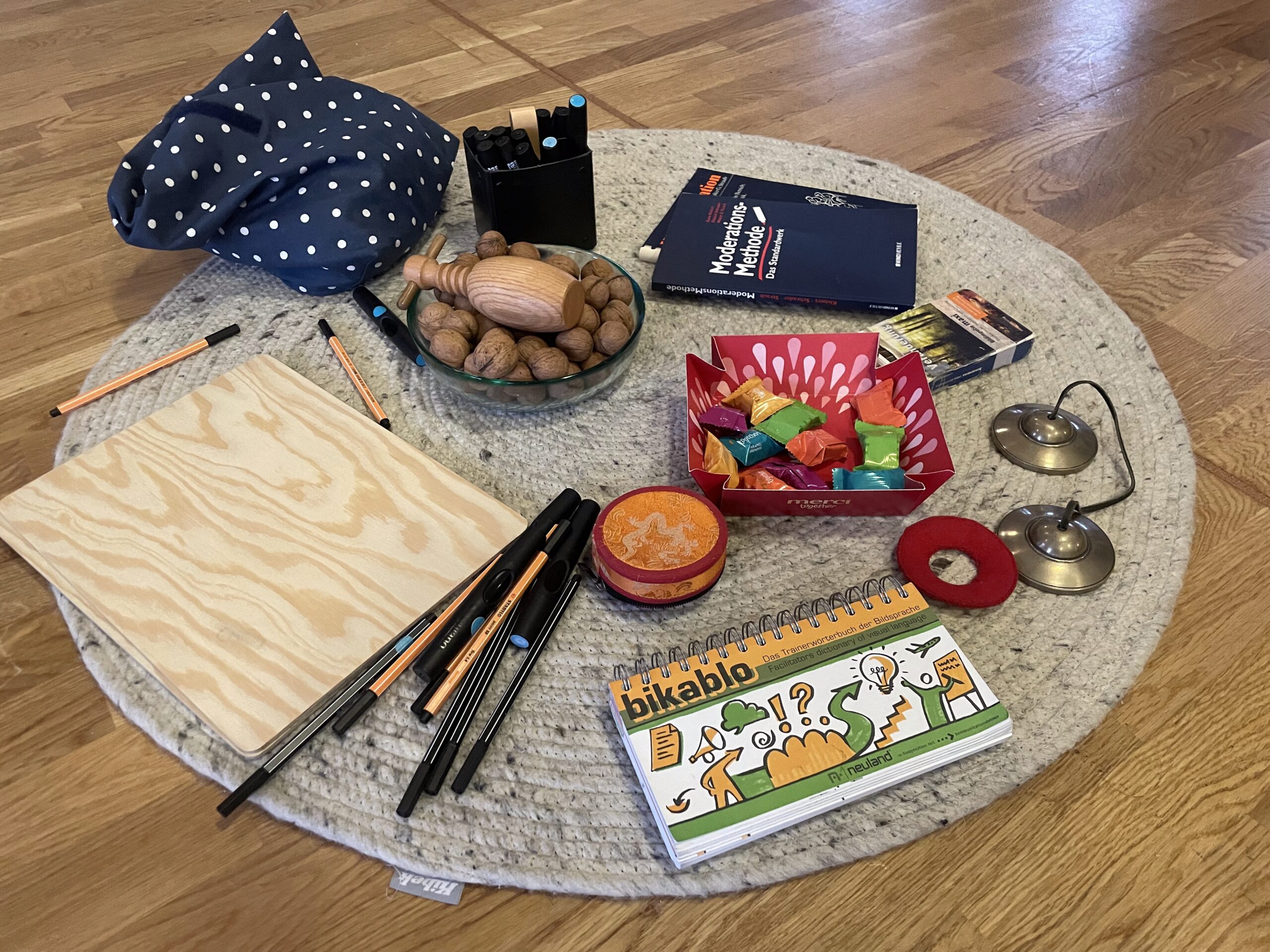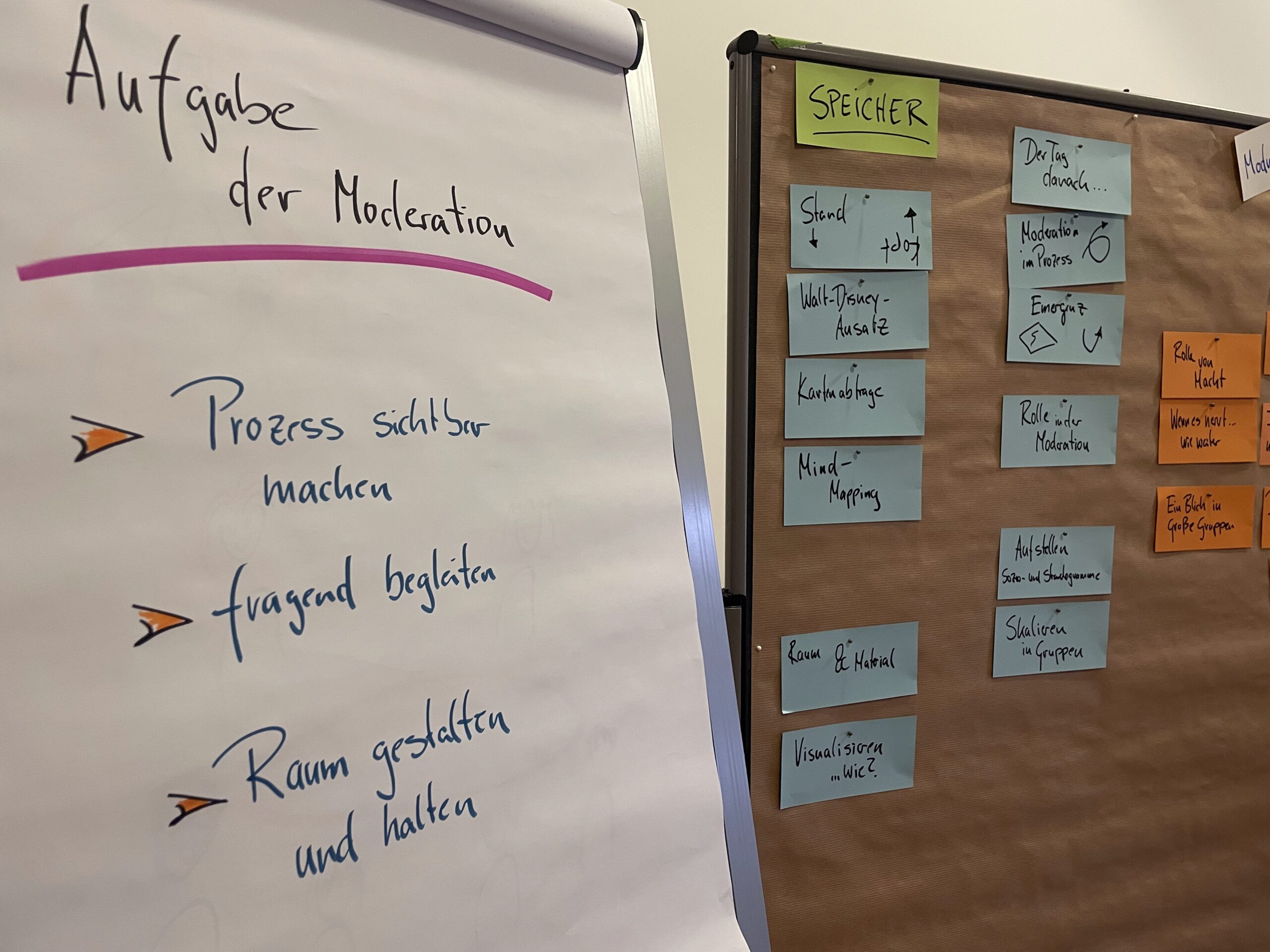 Wir sprachen darüber, wie das äußere Setting, Räumlichkeiten und Materialien den Prozess sinnvoll unterstützen und wie Entwicklungen und Ergebnisse visualisiert werden können. Außerdem erfuhren wir von Coach Norbert Poppe, welche Phasen ein Moderationszyklus typischerweise durchläuft.
